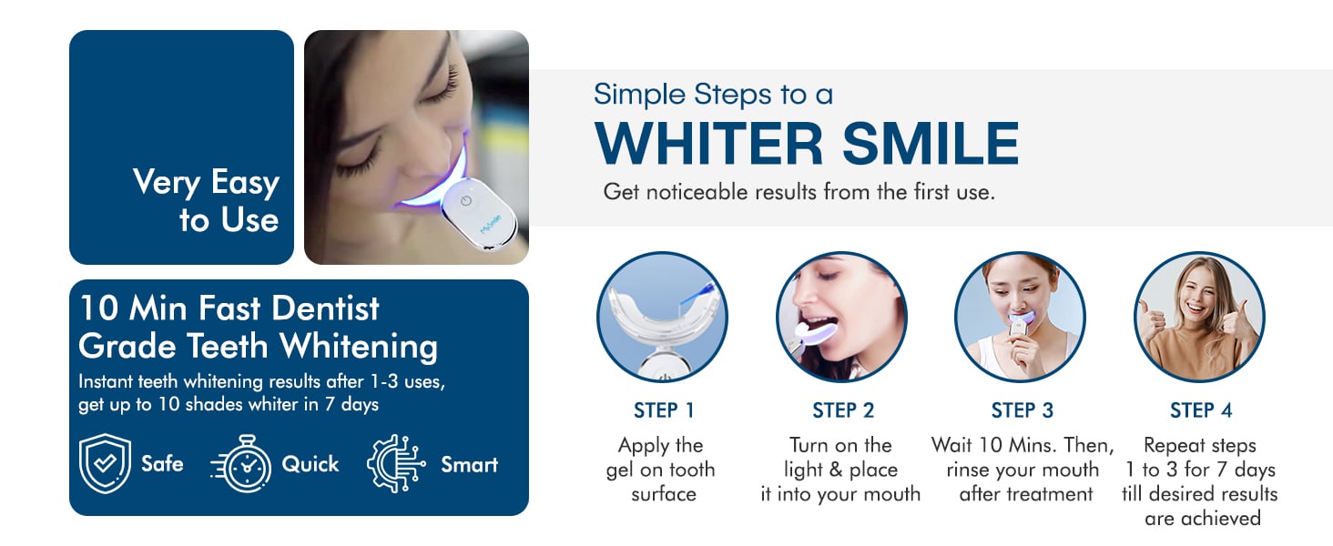 10 MIN FAST DENTAL GRADE TOOTH WHITENING - MySmile teeth whitening gel with enhanced non-sensitive formula provide sustained peroxide release for superior whitening results. Designed for sensitive teeth whitening, the advanced LED teeth whitening light technology ensures that each whitening session takes just 10 minutes, and you'll see immediate results