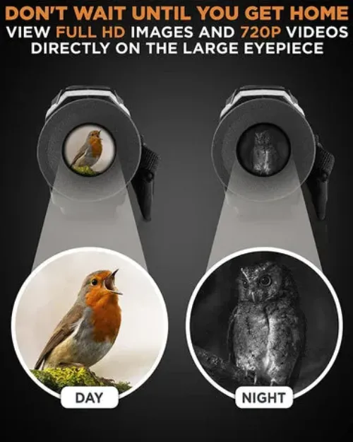 - ?Clear Vision in the Dark: Night vision monoculars with 850nm infrared illuminator and full optical system, allows you to see animals or plants clearly in dark or low ambient light. It captures high-definition photos and videos with excellent optical clarity during the day, in low light or at night.