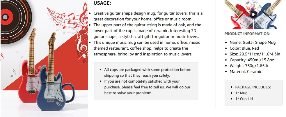 NICE NOVELTY GIFT IDEA:This well-made guitar ceramic mug will be a perfect music gift for guitarists, music teachers, music lovers and guitar lovers, helping them inspire music inspiration. Also give this fun gift to your family and friends on Birthday, Christmas, Teacher's Day, Mother's Day, Father's Day, they will love and be amazed.