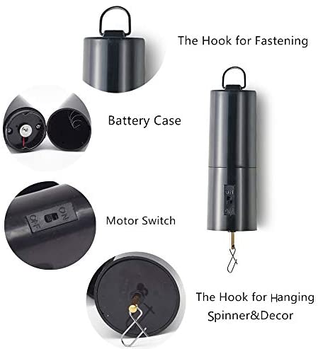A hanging hook at the top lets you attach the motor to a tree or hook on your deck or balcony. Motor has an on/off switch and timer; stays on for 6 hours, off for 18. Can be enjoyed indoors or out. Takes D batteries, not included. Spinner not included.