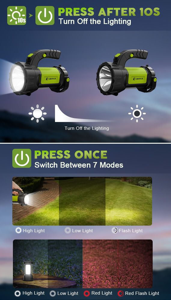 MULTIPEL USE SCENARIOS: Rechargeable flashlights are essential survival equipment for outdoor enthusiasts. They are the perfect kit for camping, hiking, fishing, or even night walking. In case of home power failure during hurricanes or storms, these lantern flashlights provide a reliable source of illumination, ensuring security and comfort