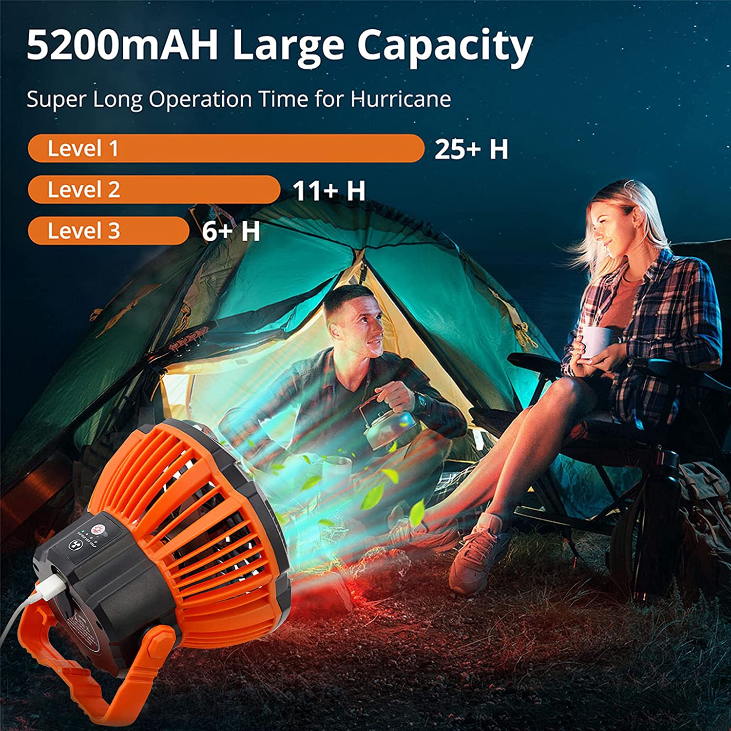 This fan with battery rechargeable has a 5200mAh battery capacity,which can be used as an emergency power source to charge mobile phones, GPS, MP3 or iPod, etc.What’s more?fully charging in 6-8 hours, working 6-25 hours,It was born for camping.