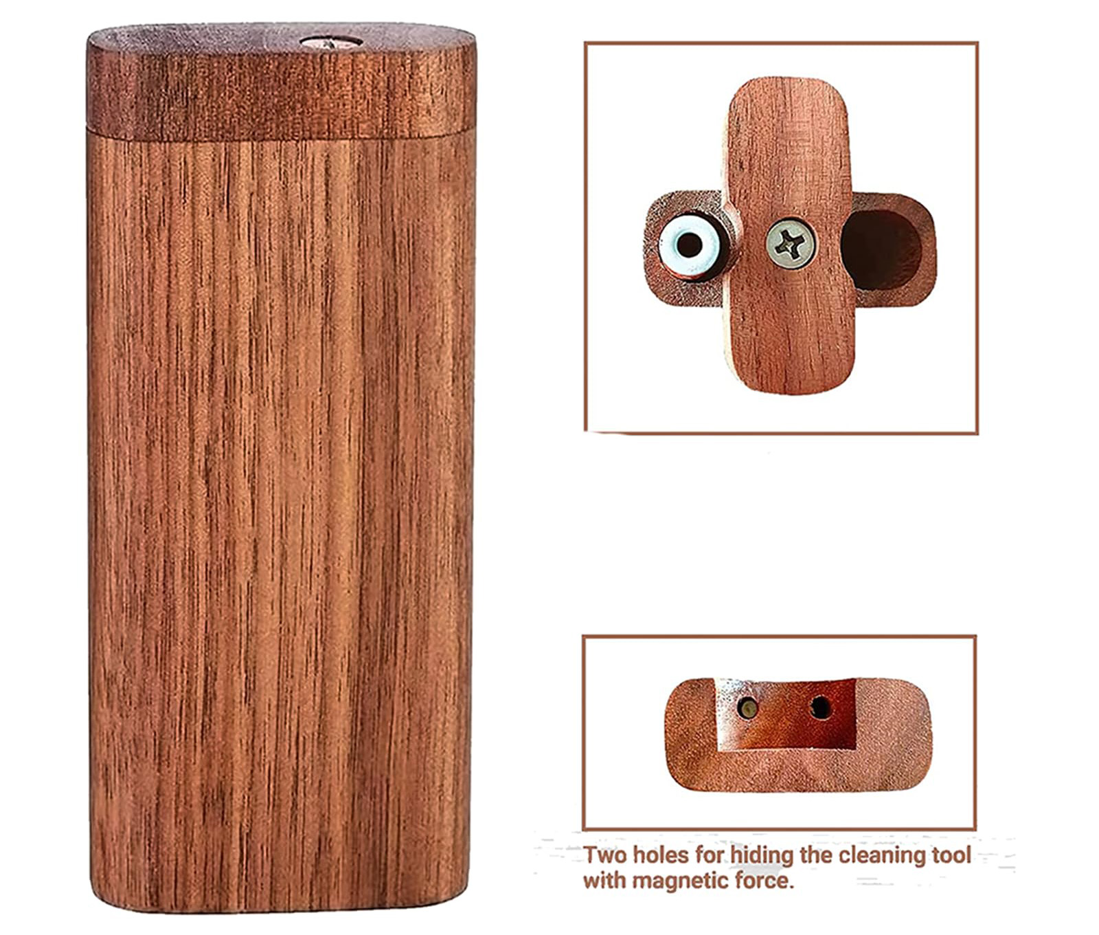 It has two differently - sized holes. The larger one holds tobacco, etc., and the smaller one has an aluminum alloy cigarette holder that pops out via a spring. Two small holes at the bottom fix the cleaning hook for easy use.