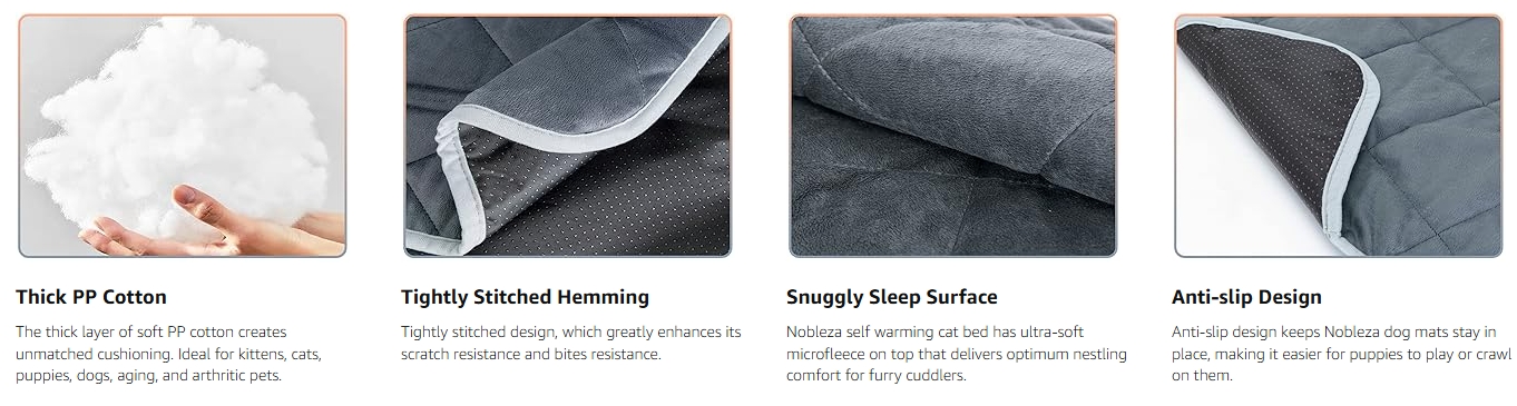 ULTIMATE COMFORT :  self warming cat bed has ultra-soft microfleece on top that provides a snuggly surface for napping. It will not make a crinkle sound by the completely noiseless mylar film for enhanced sleeping comfort. Dog bed for crate also features more fluffy filling that can cradle and support joins for pets' pain relief.